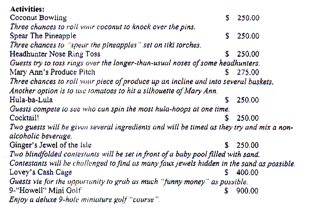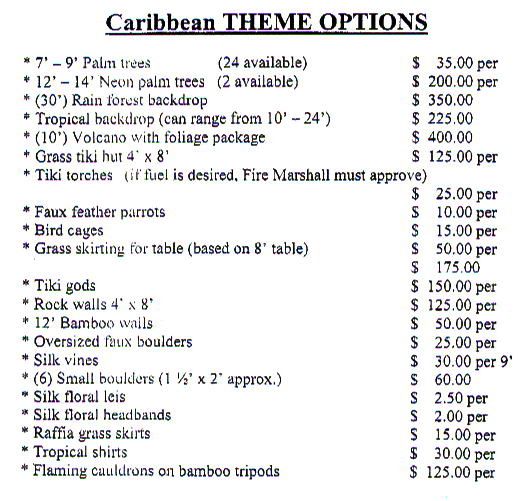 General pricing (estimates only) Pricing page one | Pricing Page 2 FOR RENTAL (Shipped from the Minneapolis / St. Paul Minnesota area) Photo 1 Small Large (2) large Tiki Gods and a Palm Tree Photo 2 Small Large (1) large Tiki God and tall bamboo shafts Photo 3 Small Large Giant Tusks and Grass Table Skirting as reception/registration decor or entrance Photo 4 Small Large Colored Skirting with Mountain/Tropical Scene Large Mural Backdrop Photo 5 Small Large Alligator and surrounding Decor Ideas Photo 6 Small Large African Theme with Grass Skirting and Lots of Animal Backgrounds Photo 7 Small Large Fish and Ocean Backdrop with tropical buffet table ideas on top of a "pier" table Photo 8 Small Large Palm Tree Decor Photo 9 Small Large Pier or Dock used as a buffet table with a green woods backdrop Photo 10 Small Large Elephant Prop with very tropical leaves/trees backdrop Photo 11 Small Large Coral Reef Backdrops with seahorse prop and "balloons" as bubbles Photo 12 Small Large Underwater City Backdrop and decor Photo 13 Small Large Fish Bowl and Real Fish Tank 8ft with underwater backdrop Photo 14 Small Large Pier type buffet table with fish backdrop with "wave" ice carving Photo 15 (2) flamingos and a Palm Tree Photo 16 Jungle Backdrop Photo 17 Sea Backdrop Photo 18 Sandcastle Photo 19 Ocean Backdrop Ice Carving and Buffet Decor/Table Photo 20 Thatch Hut Bar Decor1 Photo 21 Thatch Hut Bar Decor2 Photo 22 Thatch Hut #3 Photo 23 Thatch Hut #4 Photo 24 Volcano (actually erupts!!!) Photo 25 White Feather type palm trees Photo 26 Sample of a cut-out where you put your face behind a postcard for photos Photo 27 Sunset Backdrop Photo 28 Parrot & Martini Backdrop Photo 29 Jamaica Post Card Photo 30 Sample of Pier and Dock Decor (small pieces) Photo 31 Sample of Pier and Dock Decor (large pieces) Photo 32 Pink Flamingos for sale or rentCLICK TO VIEW OUR PARTY CATALOG featuring Leis, Grass Skirting and 100's of other items right now.