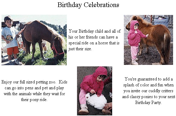 Pony rides, petting zoo, party at the farm and summer day camp.